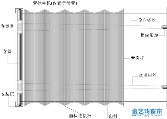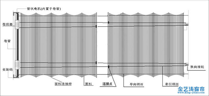 4.面料牽引桿與牽引鋼絲繩連接,在卷管(電機(jī))帶動下面料沿著導(dǎo)向鋼絲繩往復(fù)運(yùn)行,實現(xiàn)窗簾的開合。