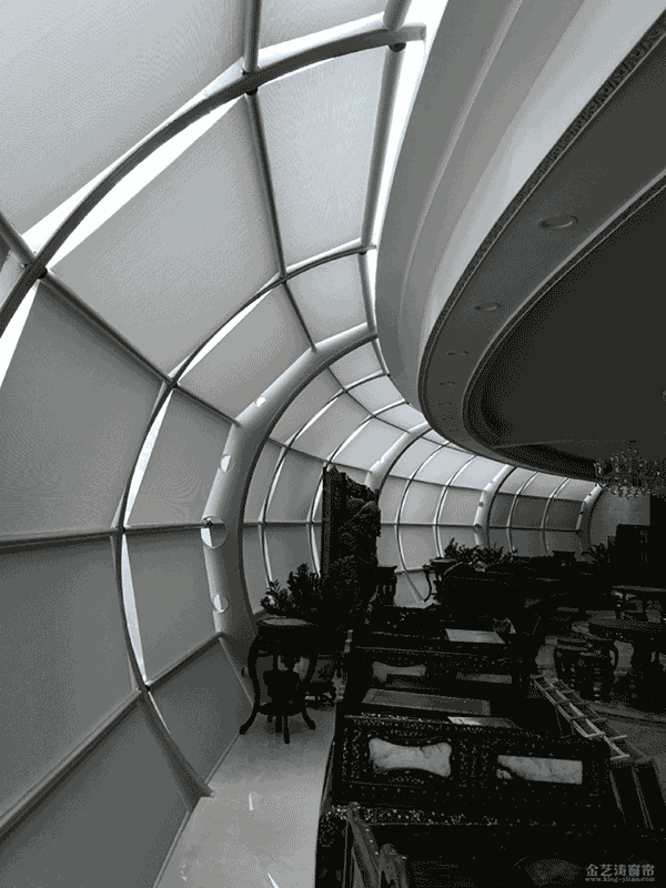 FSS電動天棚簾,為彎曲、水平、傾斜遮陽系統而設計,適用于工程和民用遮陽系統,包括建筑頂面、斜面、立面、弧形面等。